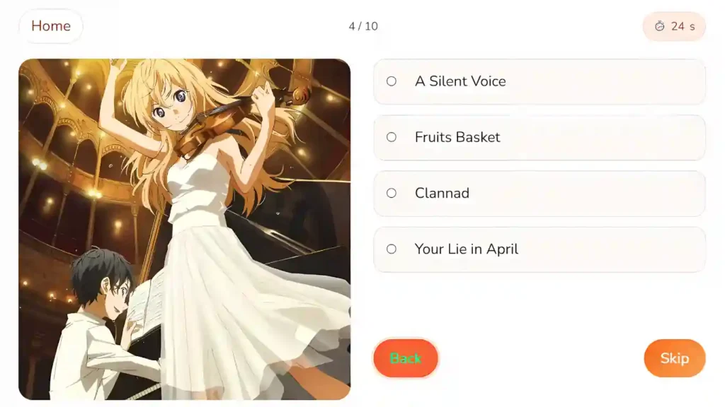 This is an interactive anime image quiz where each round shows a random picture from a well-known anime. Your job is simple. Identify the anime correctly before moving to the next one.