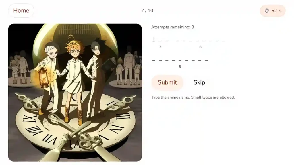 Focused mode is completely different. Here, no options are shown. You must type the anime name yourself. You get three attempts for each image, so guessing randomly will not save you. The system does allow small spelling mistakes, which means one wrong letter will not destroy your score. But you still need to actually know the title. This mode feels serious. It really tests how well you remember anime.
