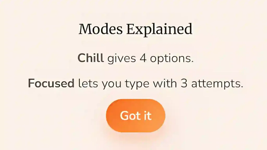 After difficulty, you choose how you want to answer. In Chill mode, you see four options under the image. One of them is correct. The others are close enough to mess with you. You simply click the one you believe is right. It feels quick and smooth, and it works well when you just want to enjoy the quiz without typing.